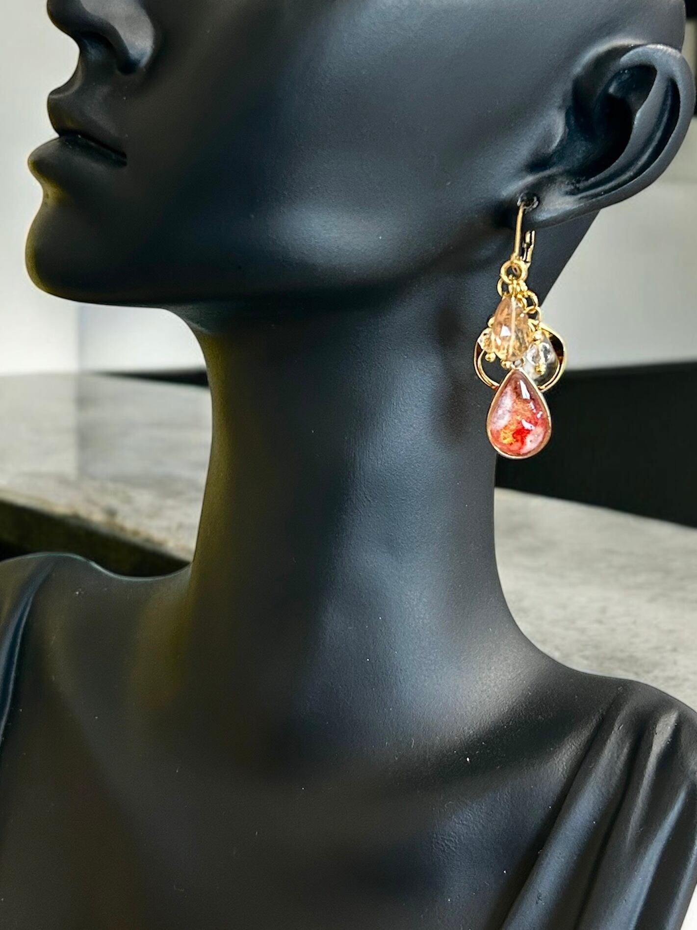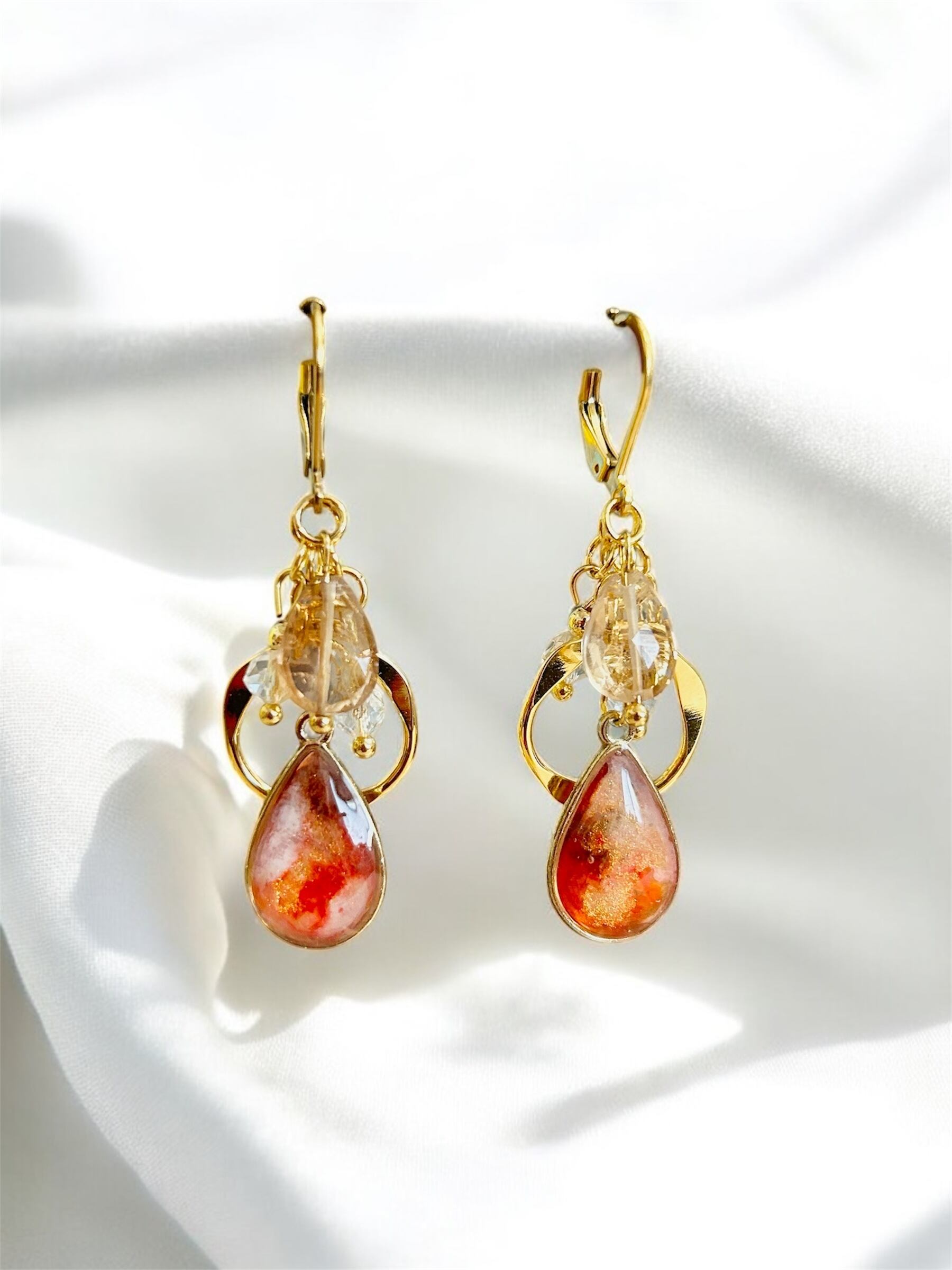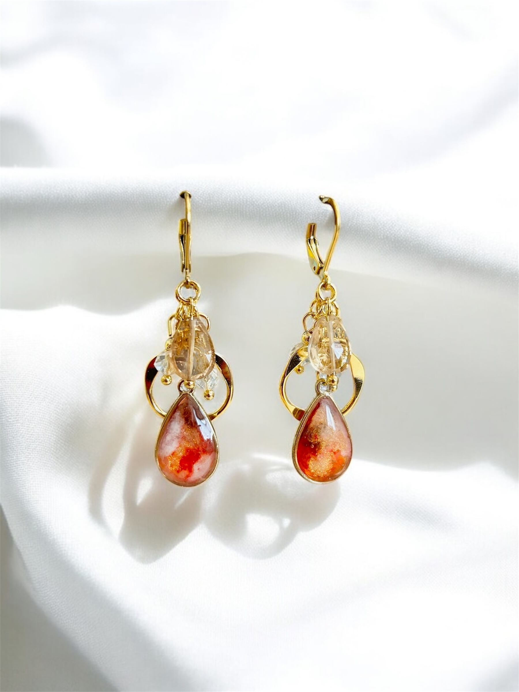 1点【アルコールインクアートレジン】鮮やかな夕焼けアートと天然石のデザインジュエリーピアスorイヤリング