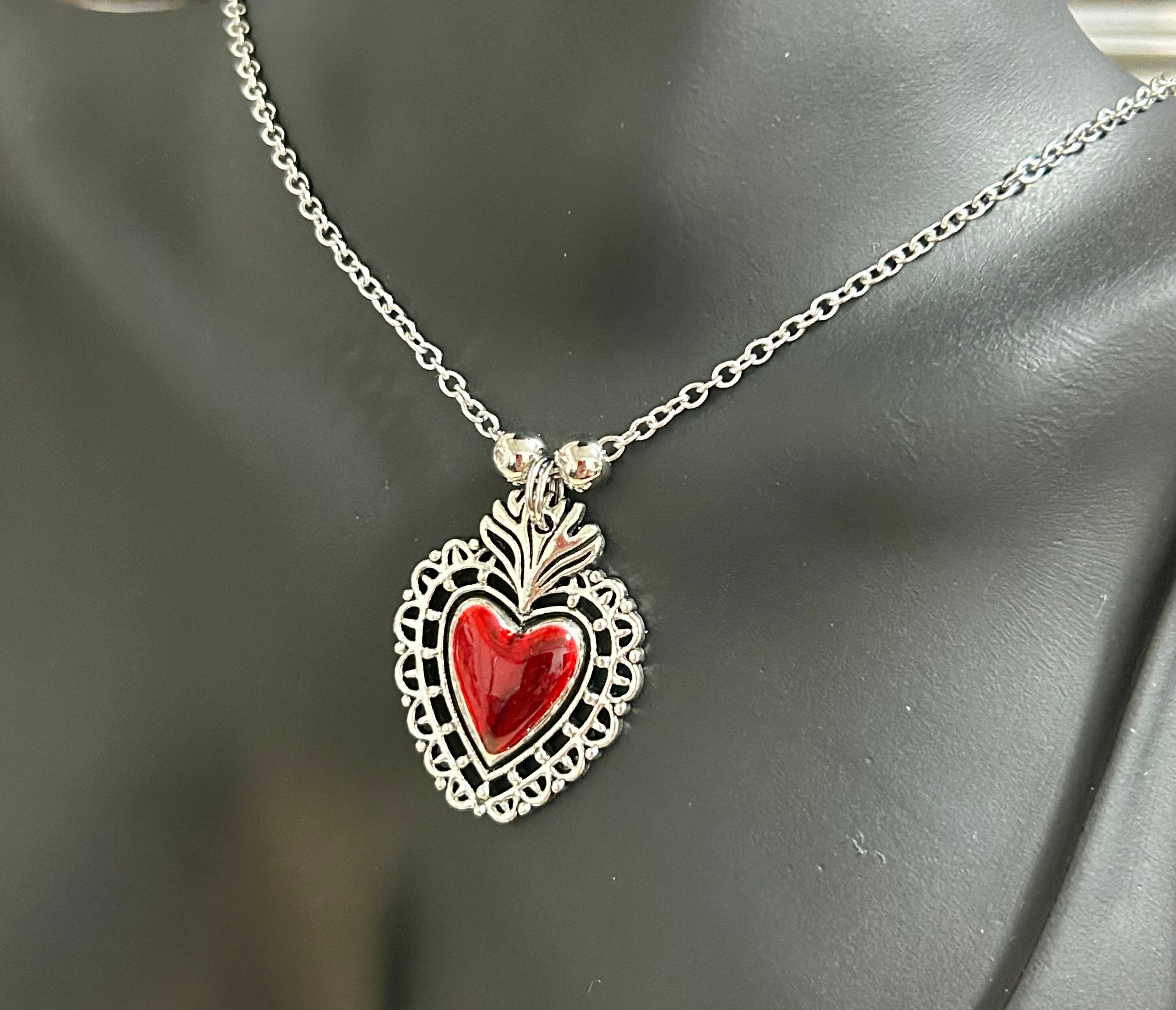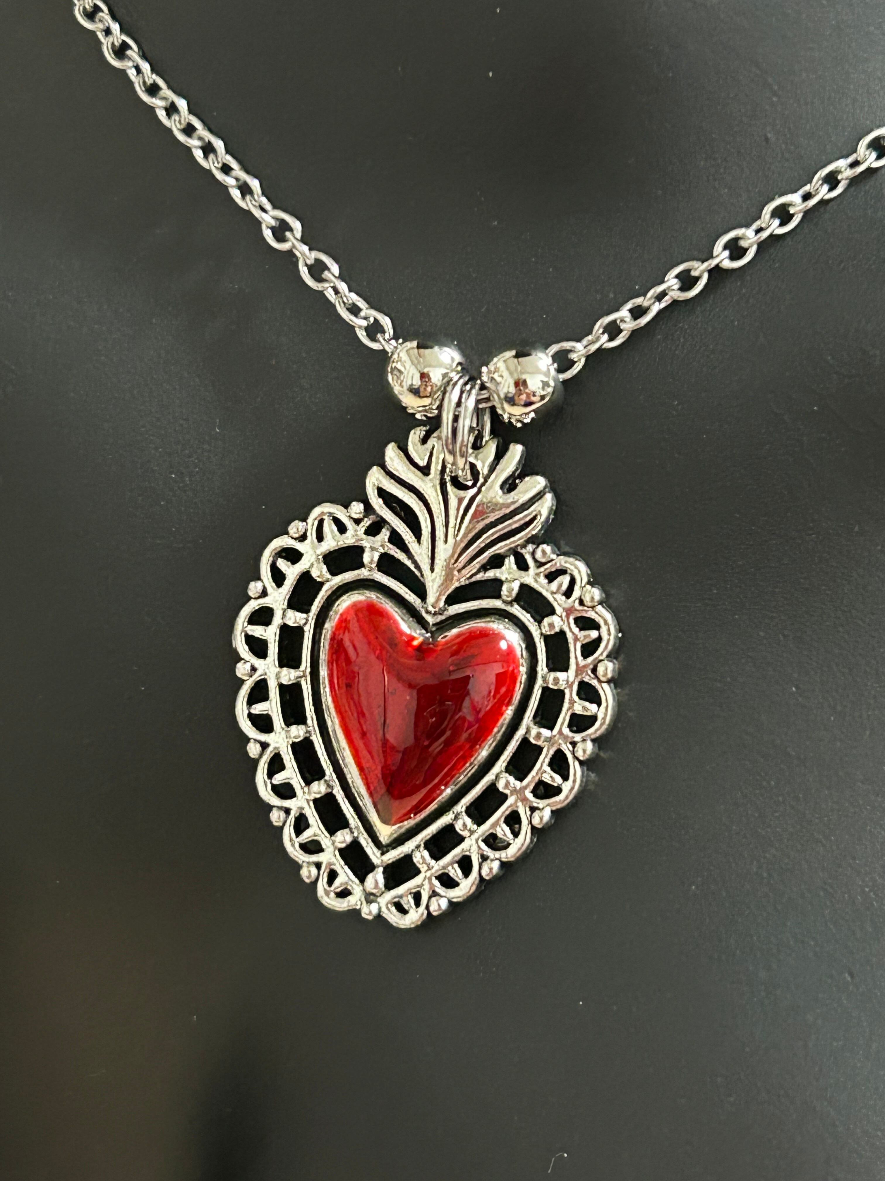 【レッドハートチャームシルバー色デザインジュエリーネックレス】